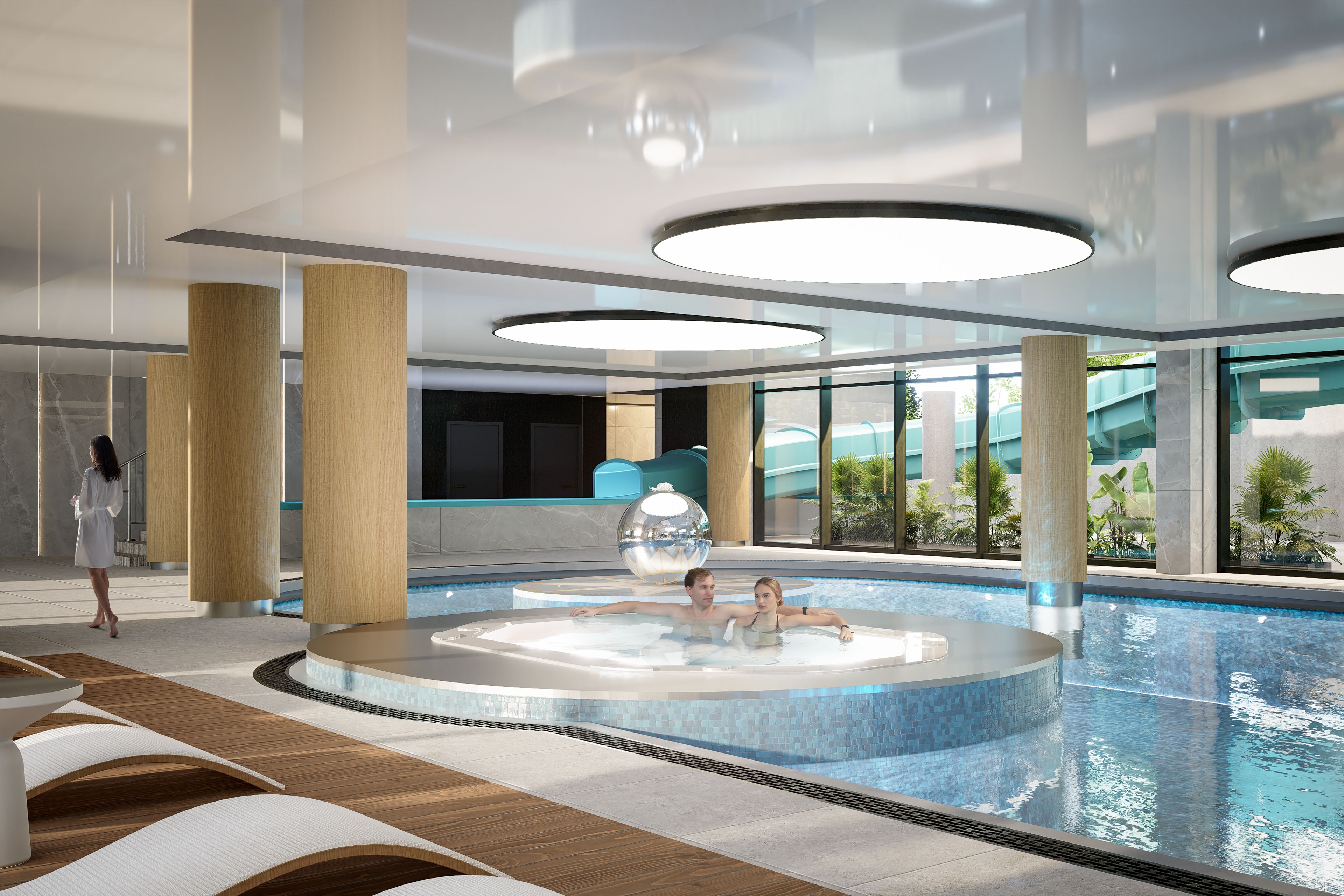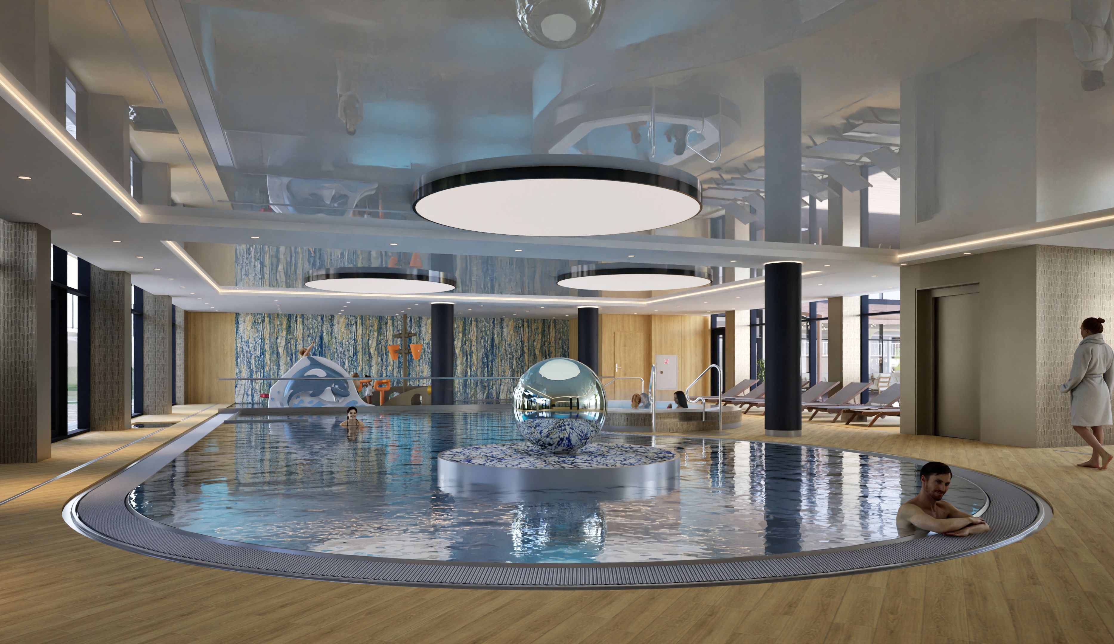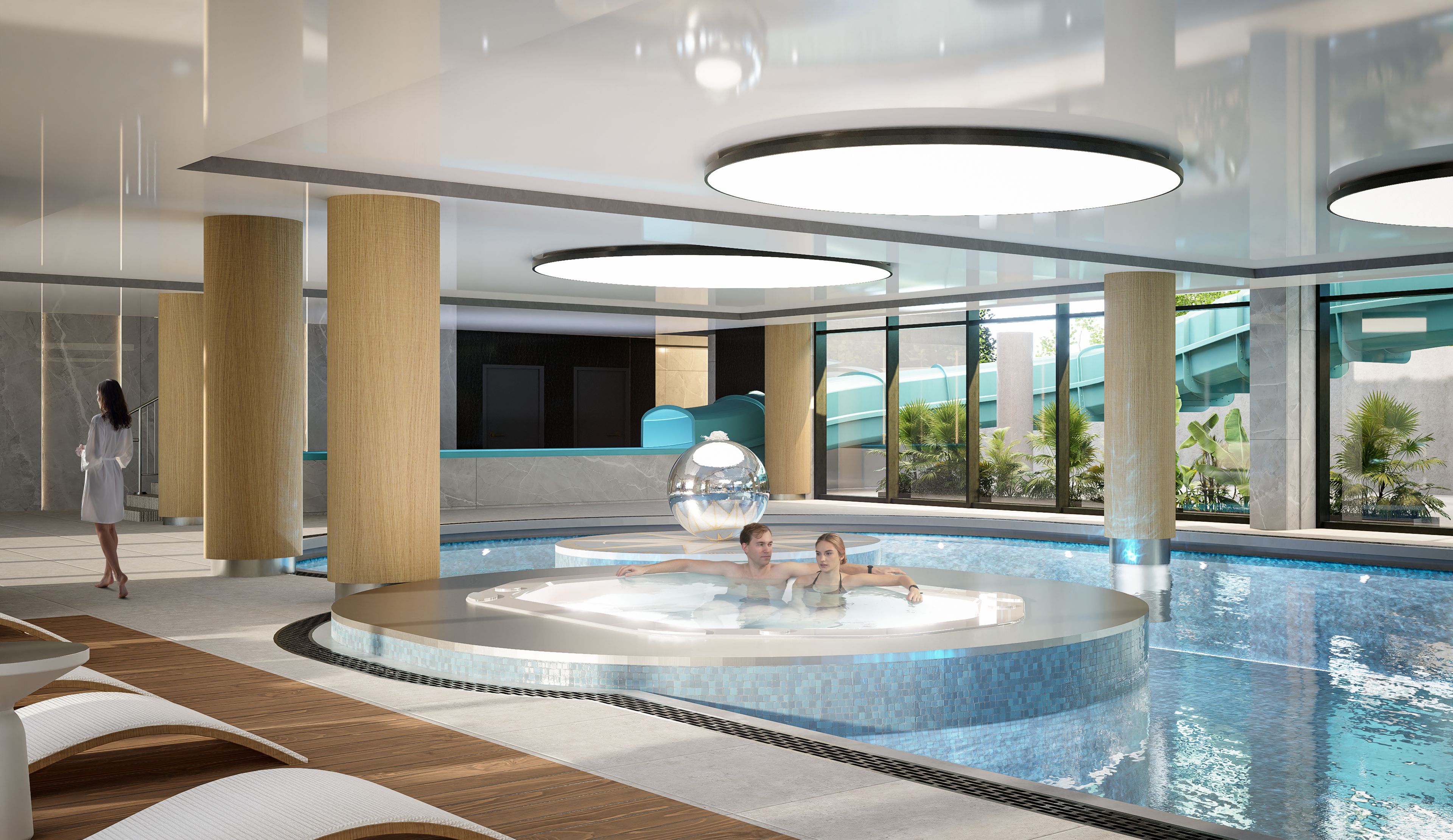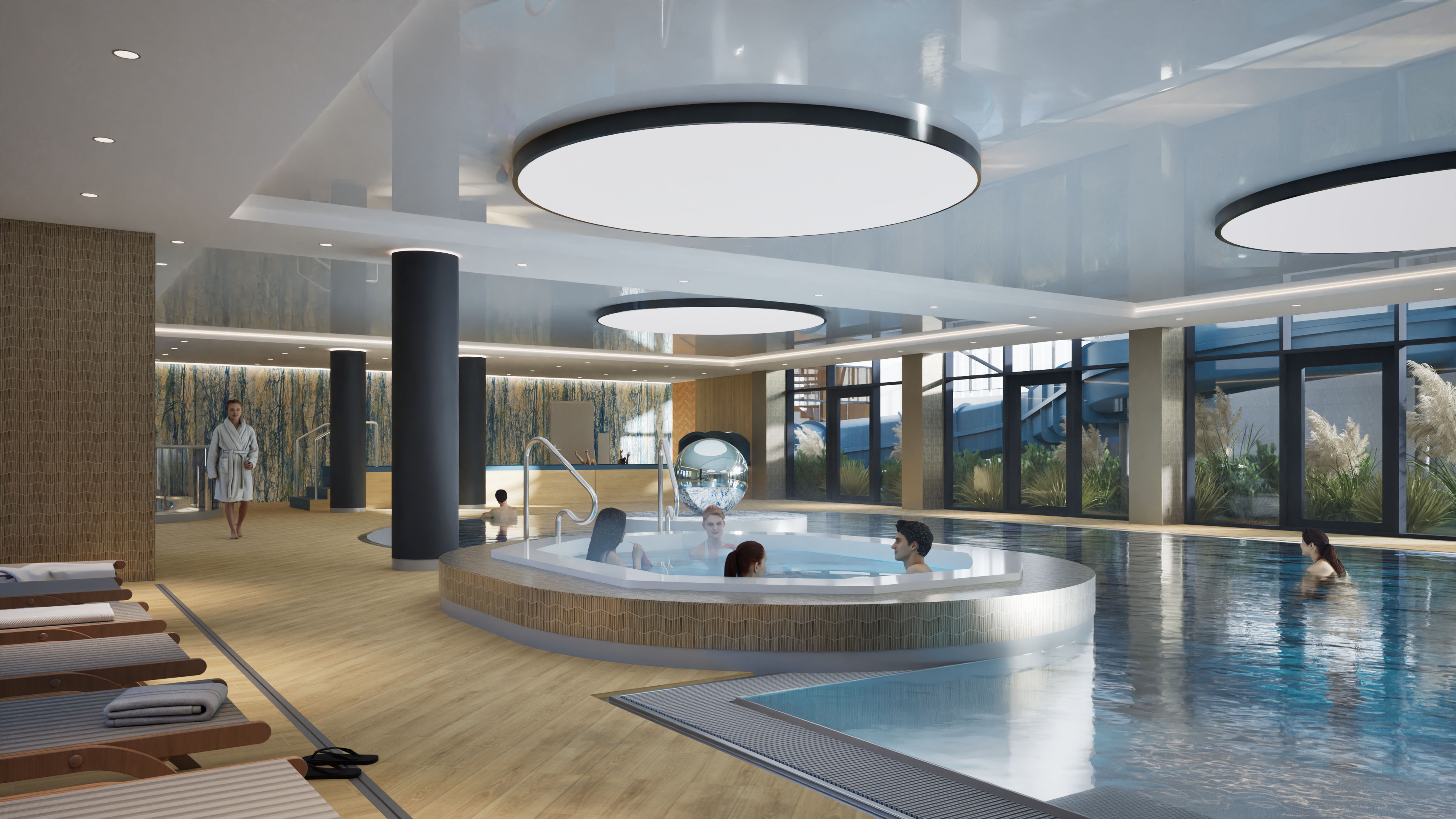 Komfortowa strefa wellness z basenem zewnętrzym, jacuzzi i drink barem pozwoli niespiesznie rozkoszować się urokami ciepłych dni. Dla najmłodszych powstanie spray park w którym będą mogli wesoło spędzać czas na zabawie. Komfortowa strefa znajdzie się również na dziedzińcu gdzie będzie można skorzystać ze strefy wellness lub zwyczajnie poleniuchować na tarasie.