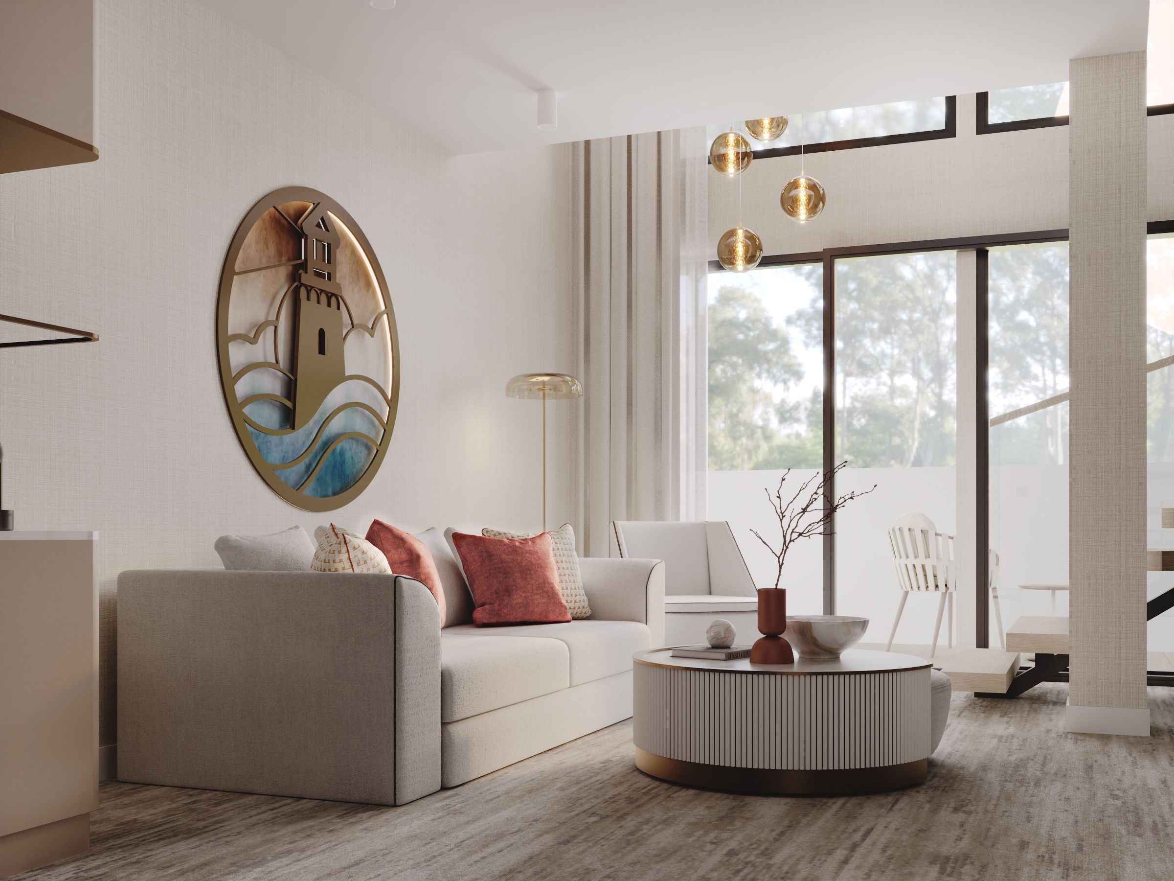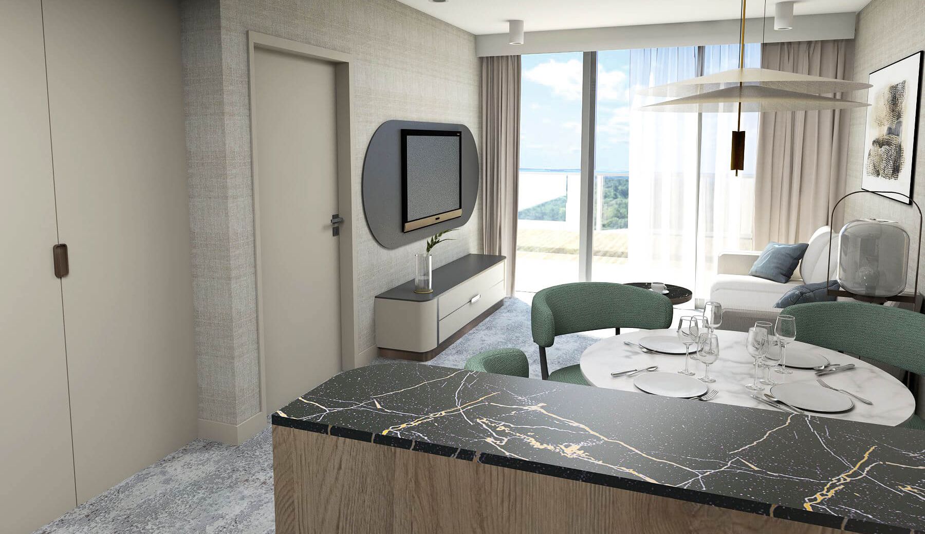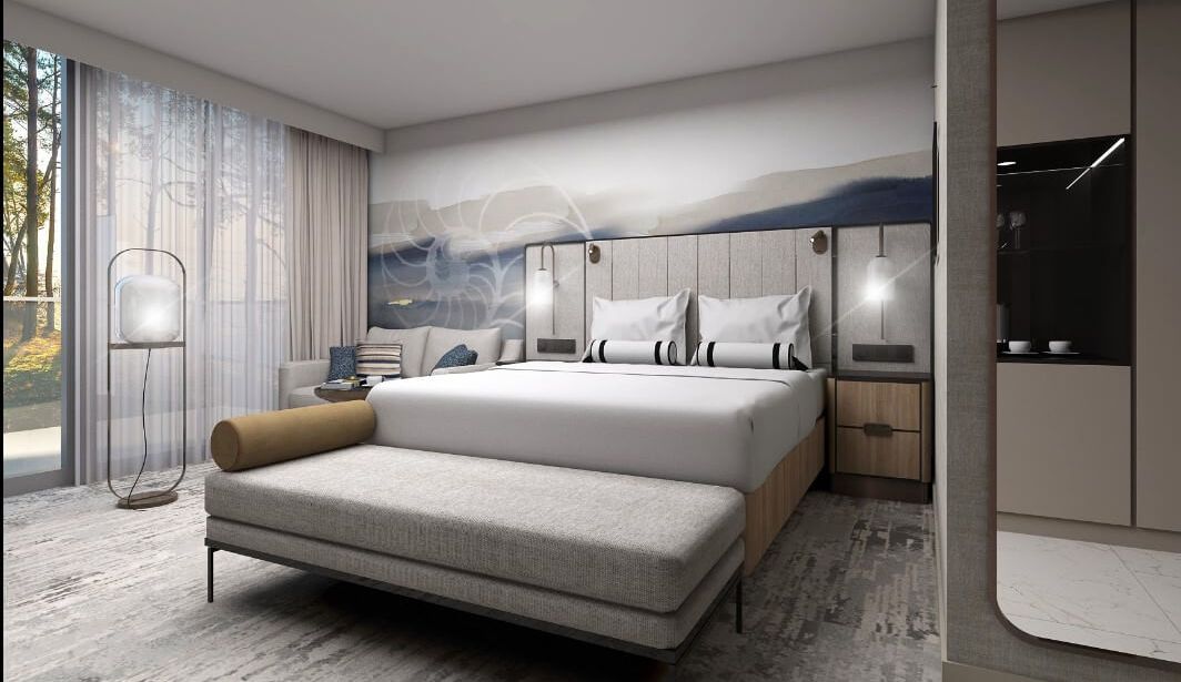Projekt resortu subtelnie nawiązuje do charakteru regionu. Front budynku wzbogacono delikatnymi elementami, które mogą przywoływać na myśl rozwinięte żagle nierozerwalnie łączące się z morzem. Podczas projektowania postawiliśmy na funkcjonalność, maksymalną wygodę użytkowników oraz standard odpowiadający pięciogwiazdkowemu hotelowi. W całym resorcie nie brakuje detali wprost nawiązujących do nadmorskiej natury, kolorów mieniących się odcieniami piasku, morza i spalonych słońcem roślin.