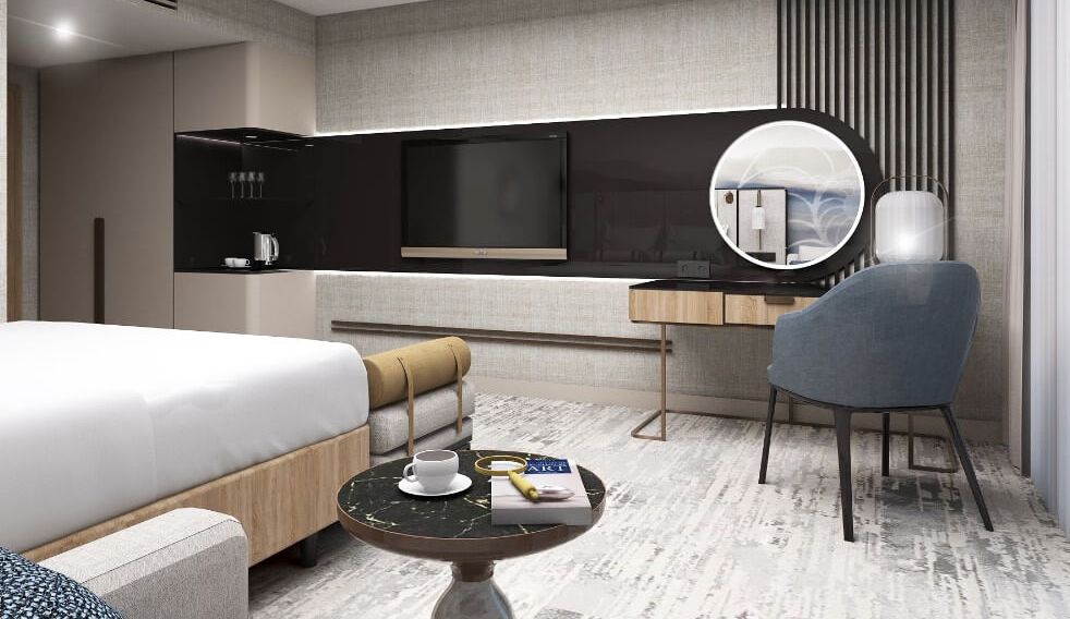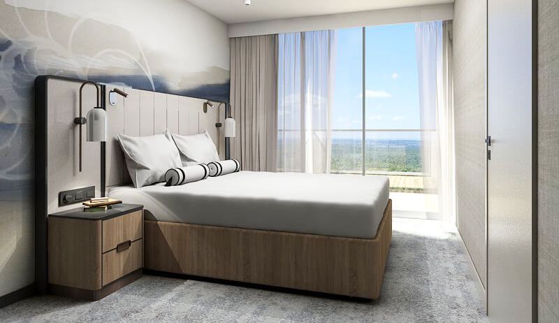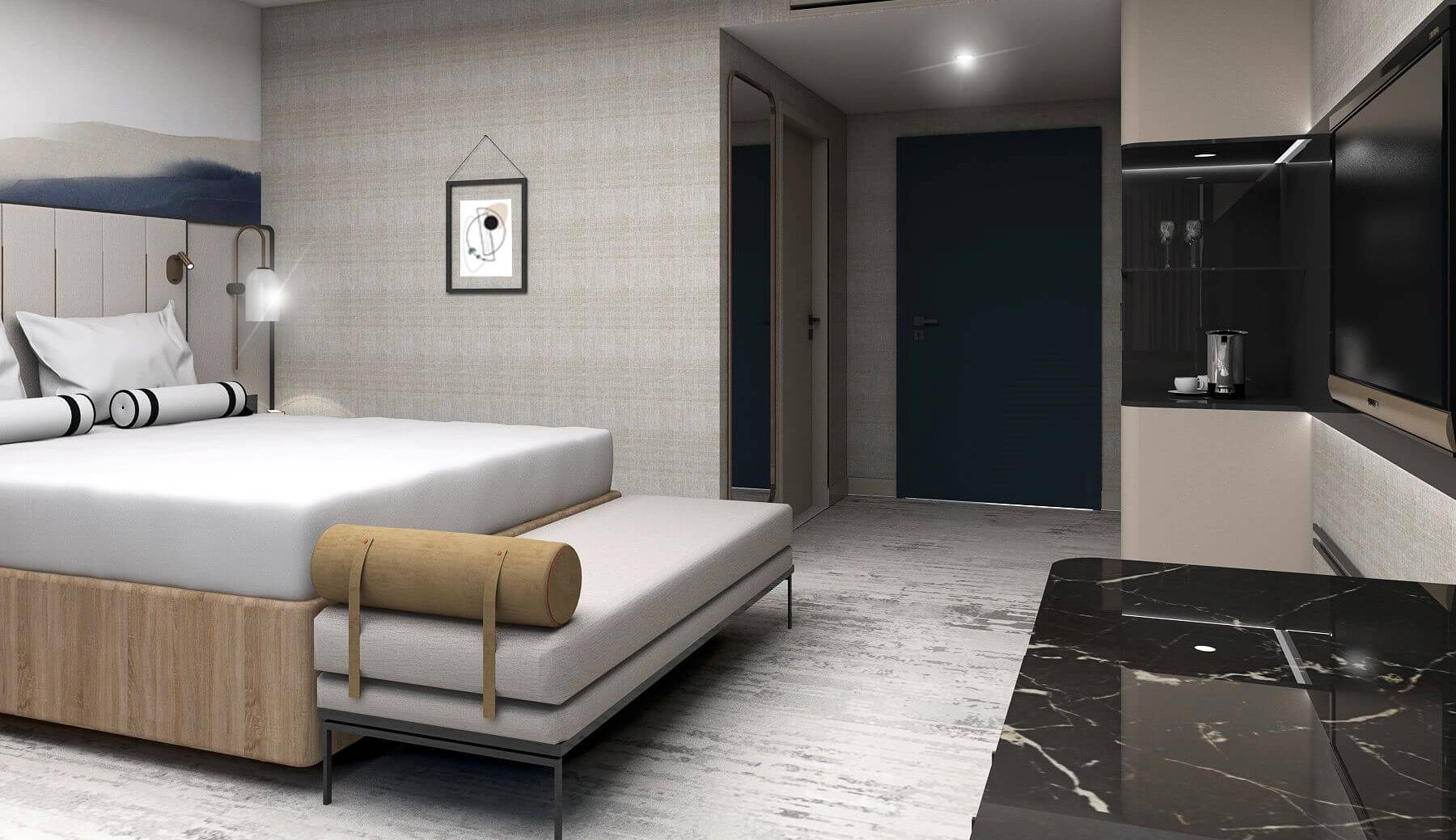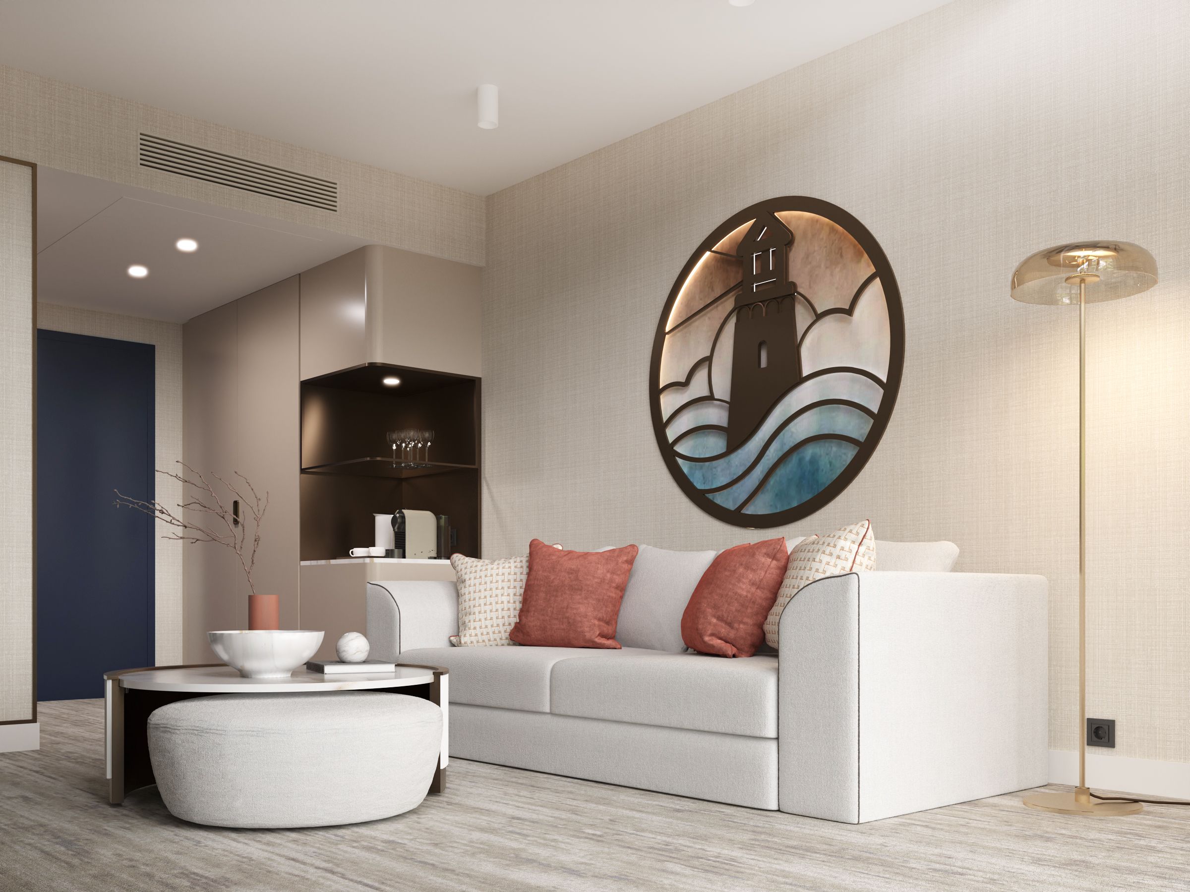 Projekt resortu subtelnie nawiązuje do charakteru regionu. Front budynku wzbogacono delikatnymi elementami, które mogą przywoływać na myśl rozwinięte żagle nierozerwalnie łączące się z morzem. Podczas projektowania postawiliśmy na funkcjonalność, maksymalną wygodę użytkowników oraz standard odpowiadający pięciogwiazdkowemu hotelowi. W całym resorcie nie brakuje detali wprost nawiązujących do nadmorskiej natury, kolorów mieniących się odcieniami piasku, morza i spalonych słońcem roślin.