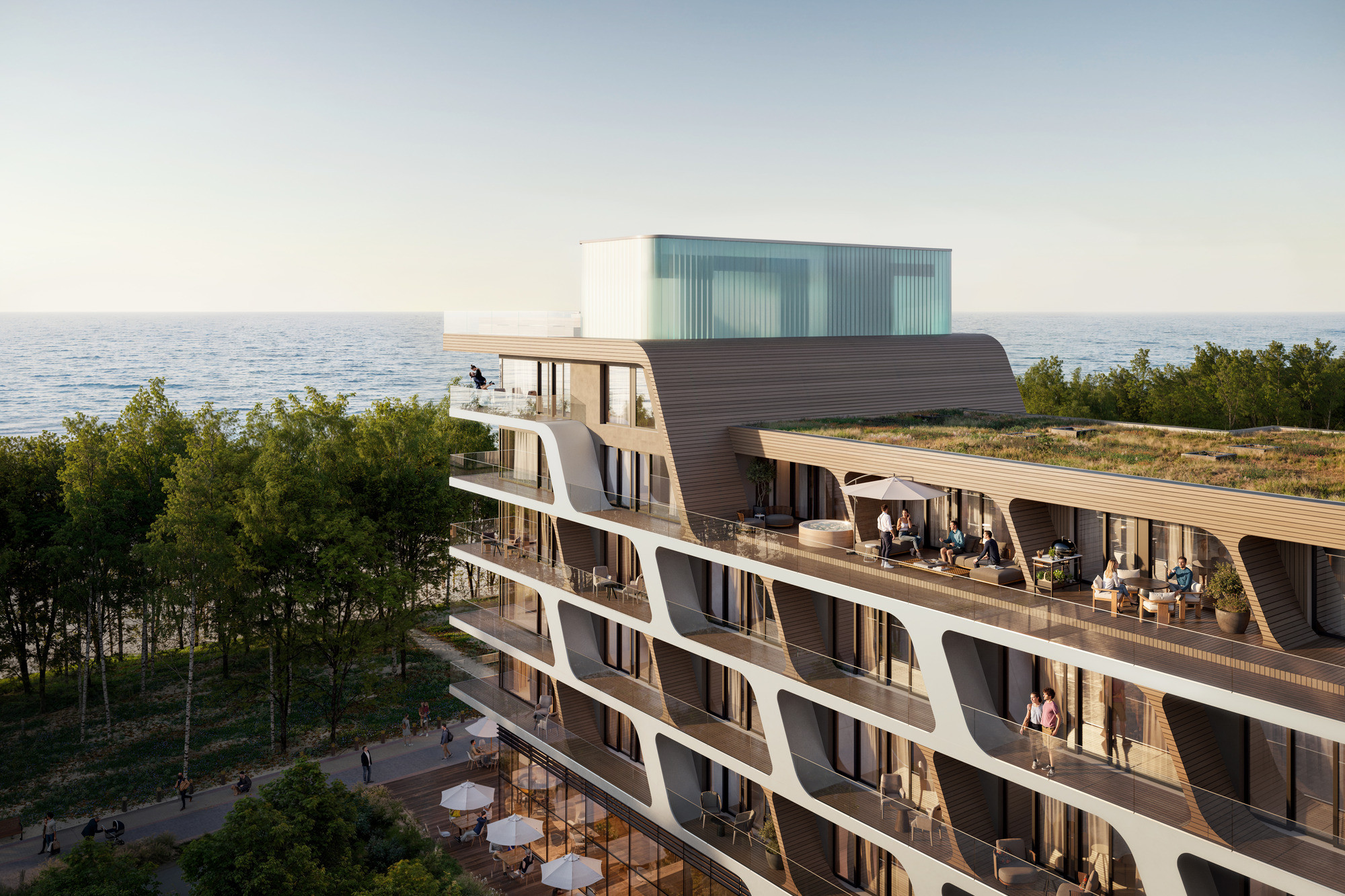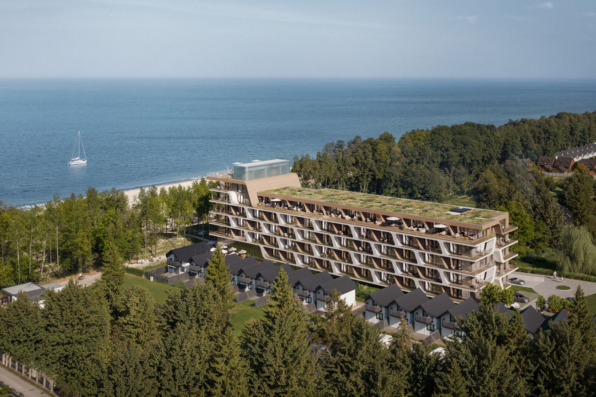 Aston Vue Sianożęty to prestiżowy projekt apartamentowy zlokalizowany w pierwszej linii brzegowej Bałtyku, bezpośrednio przy promenadzie i trasie rowerowej Velo Baltica. To jedna z najbardziej pożądanych lokalizacji na polskim wybrzeżu – miejsce, w którym prywatność, natura i nowoczesna architektura tworzą spójną, ponadczasową całość. Charakterystyczna bryła budynku, inspirowana elegancją transatlantyków, została zaprojektowana tak, aby podkreślać nadmorski krajobraz i maksymalnie wykorzystywać walory widokowe. Większość apartamentów oferuje bezpośredni widok na morze, a panoramiczne przeszklenia i przestronne tarasy otwierają wnętrza na światło, przestrzeń i horyzont.