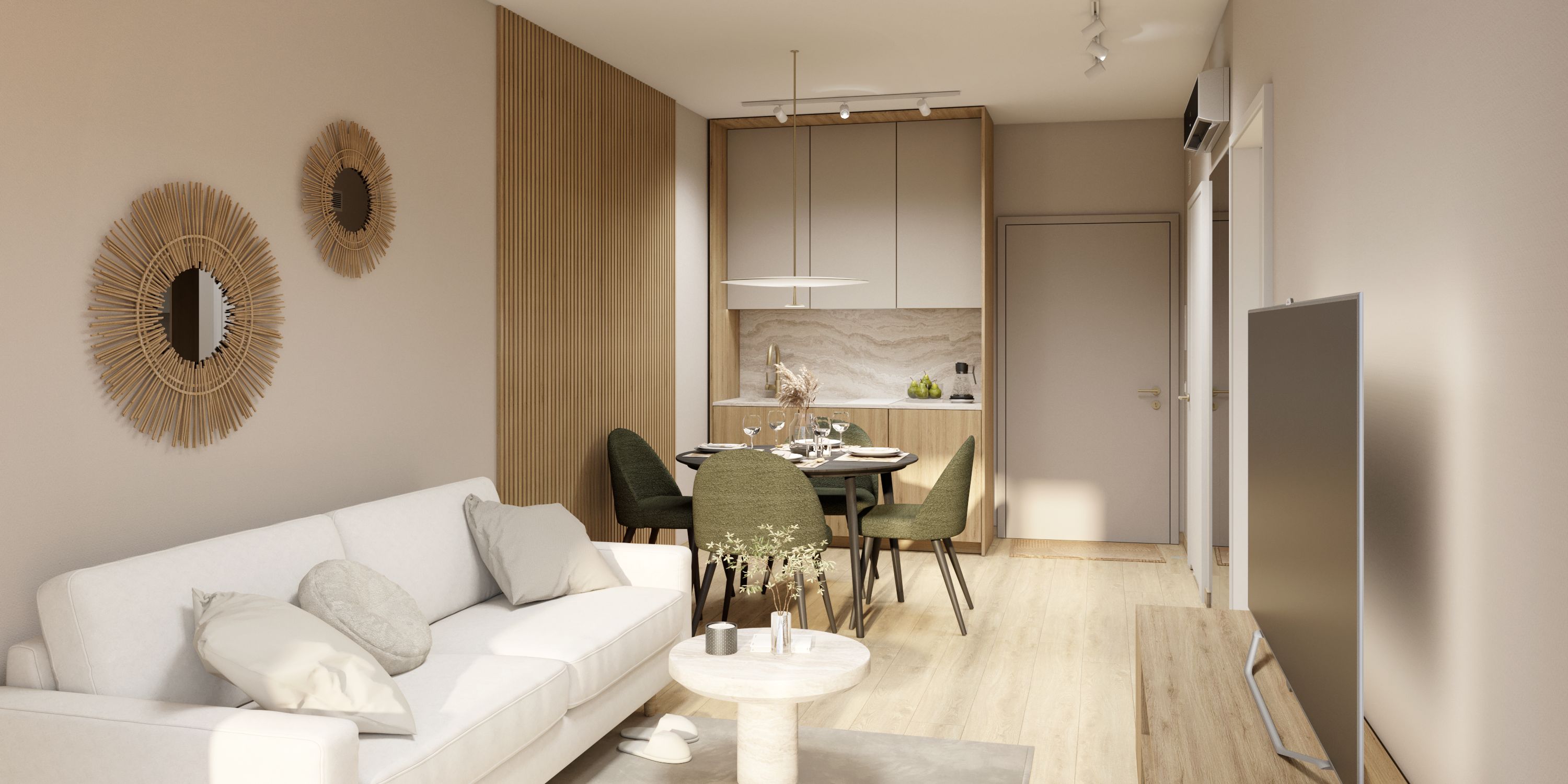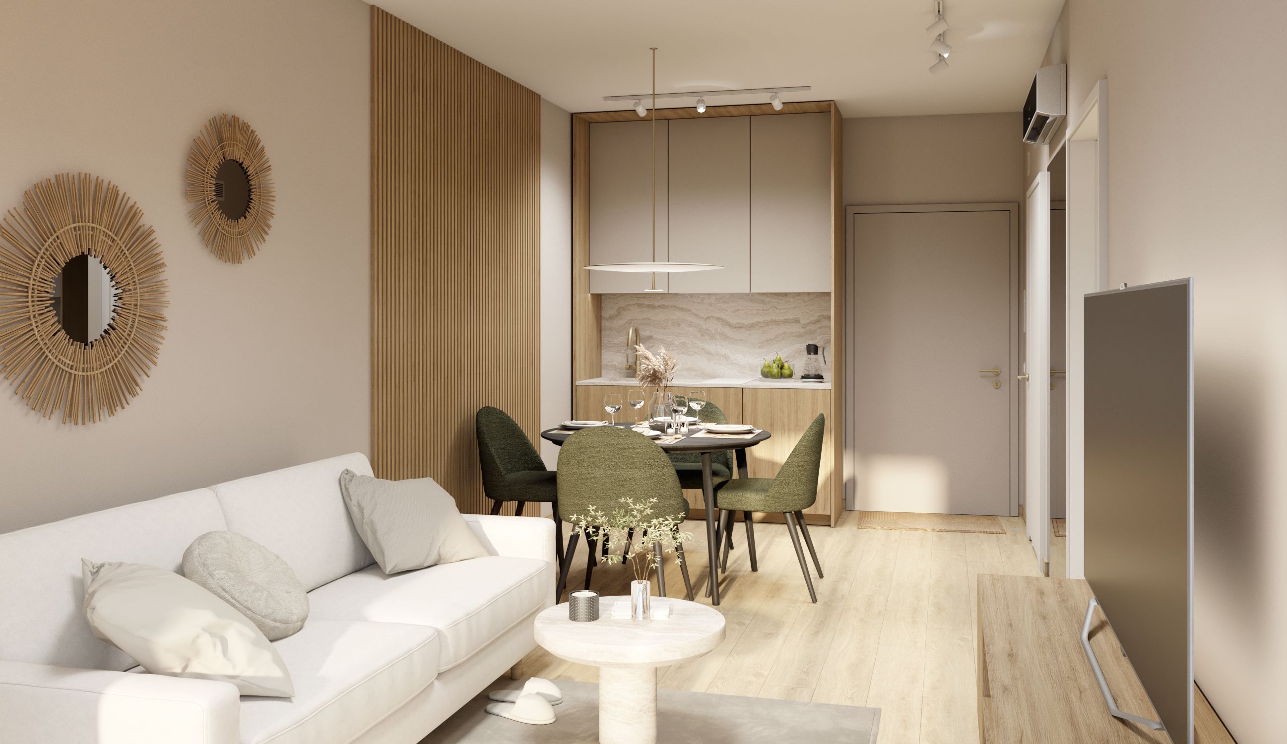 Inwestycja obejmuje 97 apartamentów o powierzchni od 29 m² do 123 m², w tym luksusowe penthouse’y. Układy mieszkań zostały przemyślane zarówno pod kątem komfortowego wypoczynku, jak i efektywnego wynajmu krótkoterminowego. Wysoki standard wykończenia, ponadczasowa estetyka oraz możliwość realizacji apartamentu w formule „pod klucz” w jednym z dwóch spójnych standardów pozwalają zachować jednolity, elegancki charakter całego obiektu. To rozwiązanie zwiększa rozpoznawalność inwestycji i jej atrakcyjność rynkową.