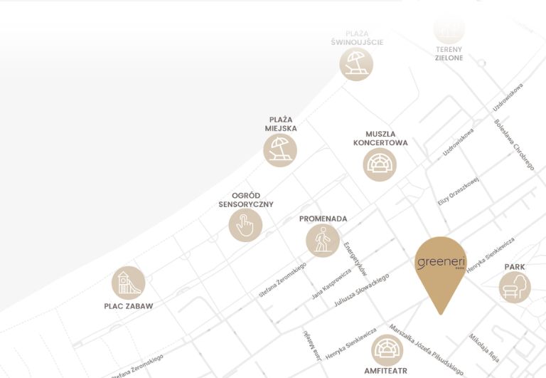 Największym atutem inwestycji “Greeneri Park” jest jej lokalizacja. Obiekt położony jest na skraju świnoujskiego Parku Zdrojowego, w otoczeniu natury, terenów rekreacyjnych, sportowych i kulturalnych. Cisza i spokój zapewniają kojący odpoczynek, natomiast bliskość promenad umożliwia dostęp do najlepszych restauracji, kawiarni oraz usług w okolicy a także możliwość czerpania z tętniącego życiem miasteczka. To wszystko zaledwie 500 metrów od najpiękniejszej plaży Bałtyku.