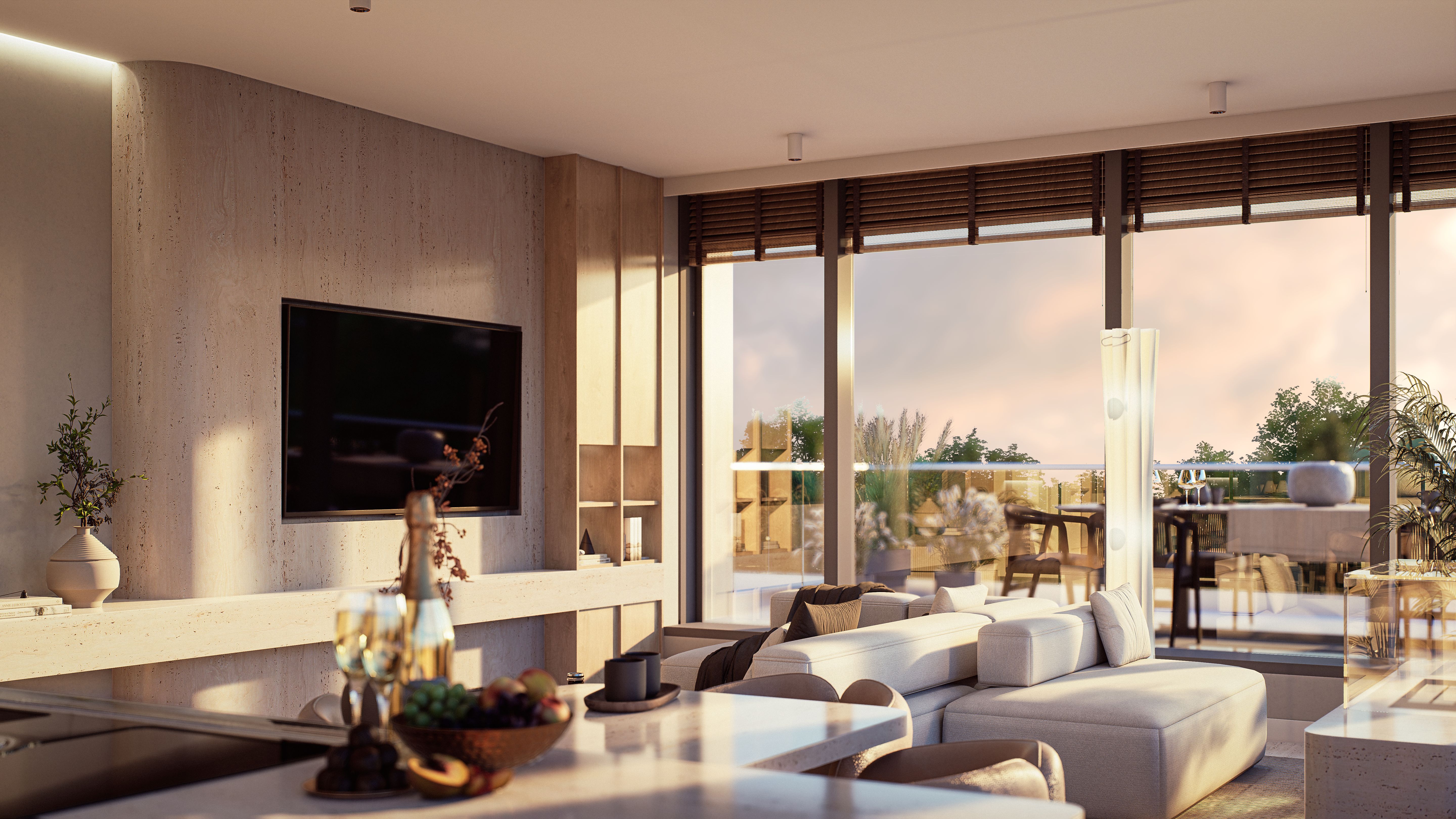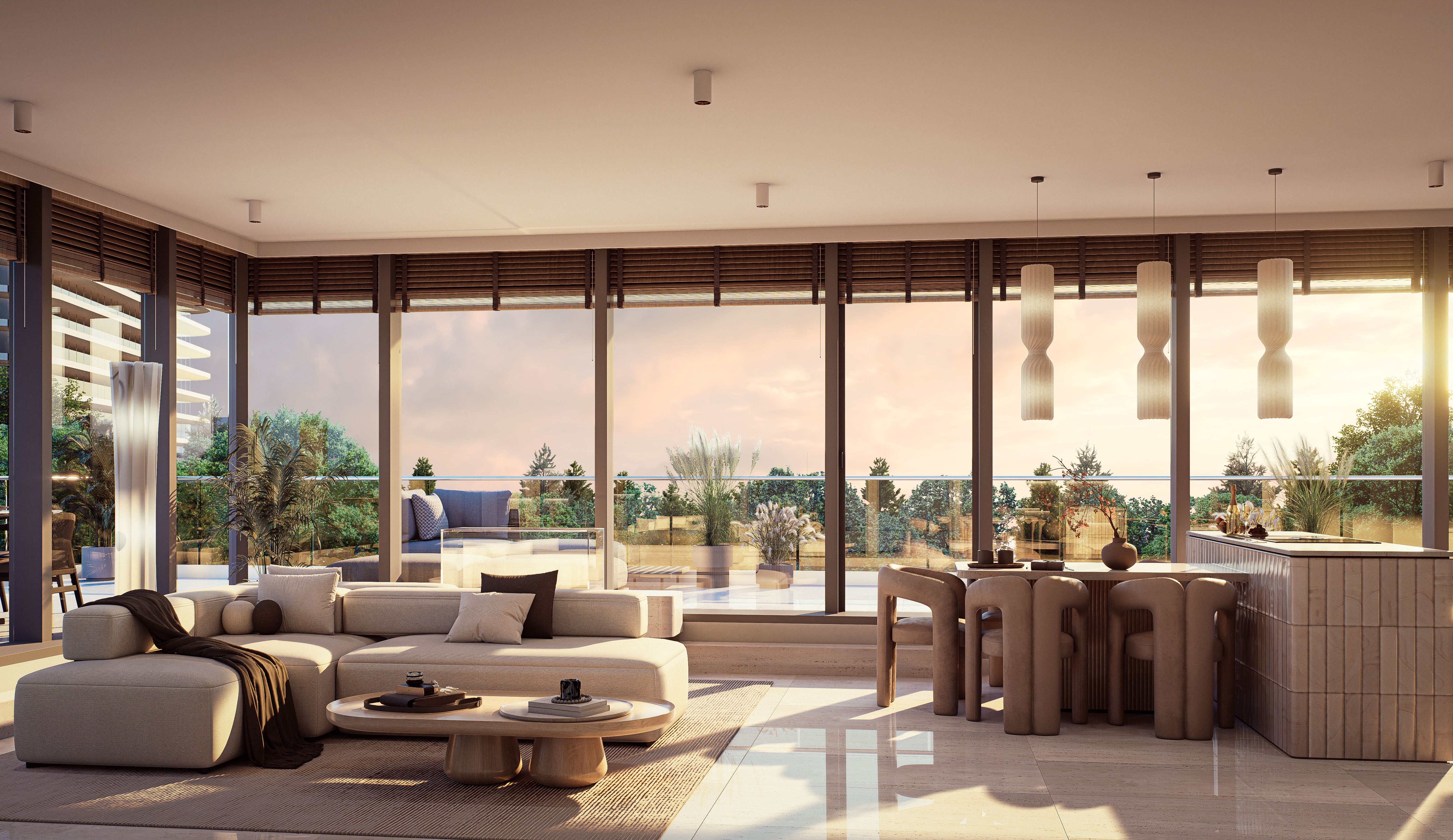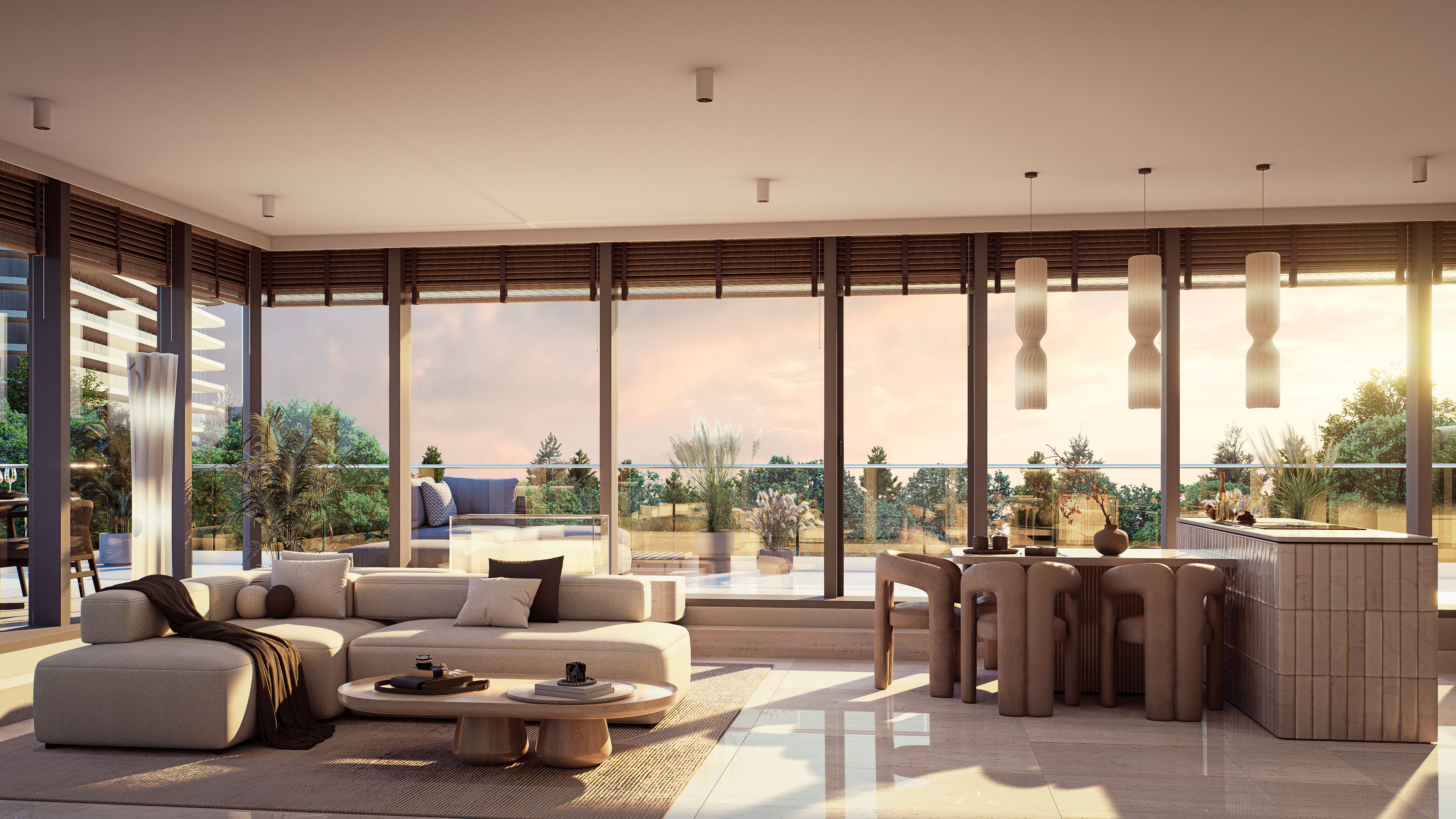 Panoramiczne przeszklenia, zielone tarasy i naturalne materiały tworzą atmosferę harmonii i wyrafinowania.