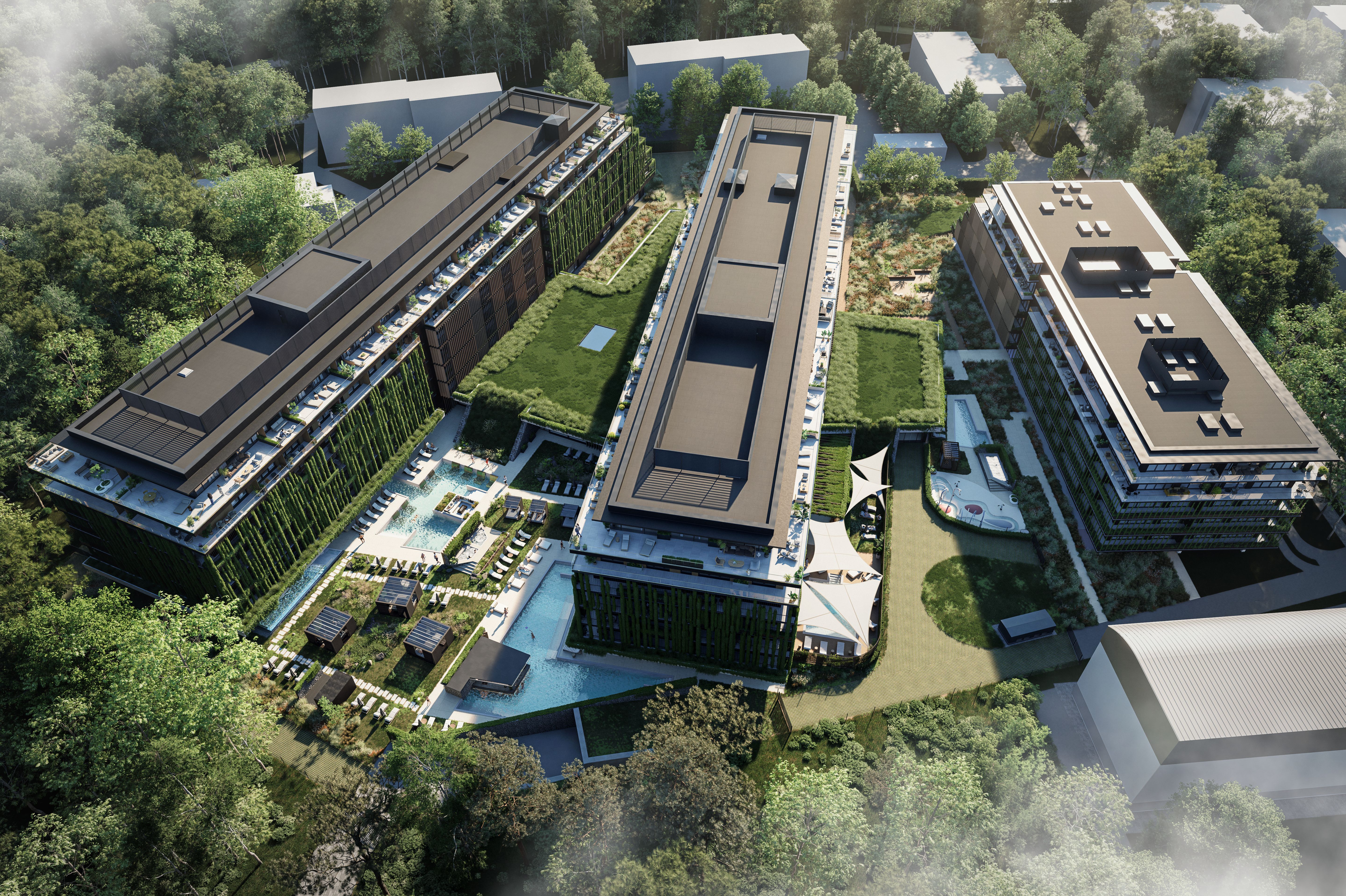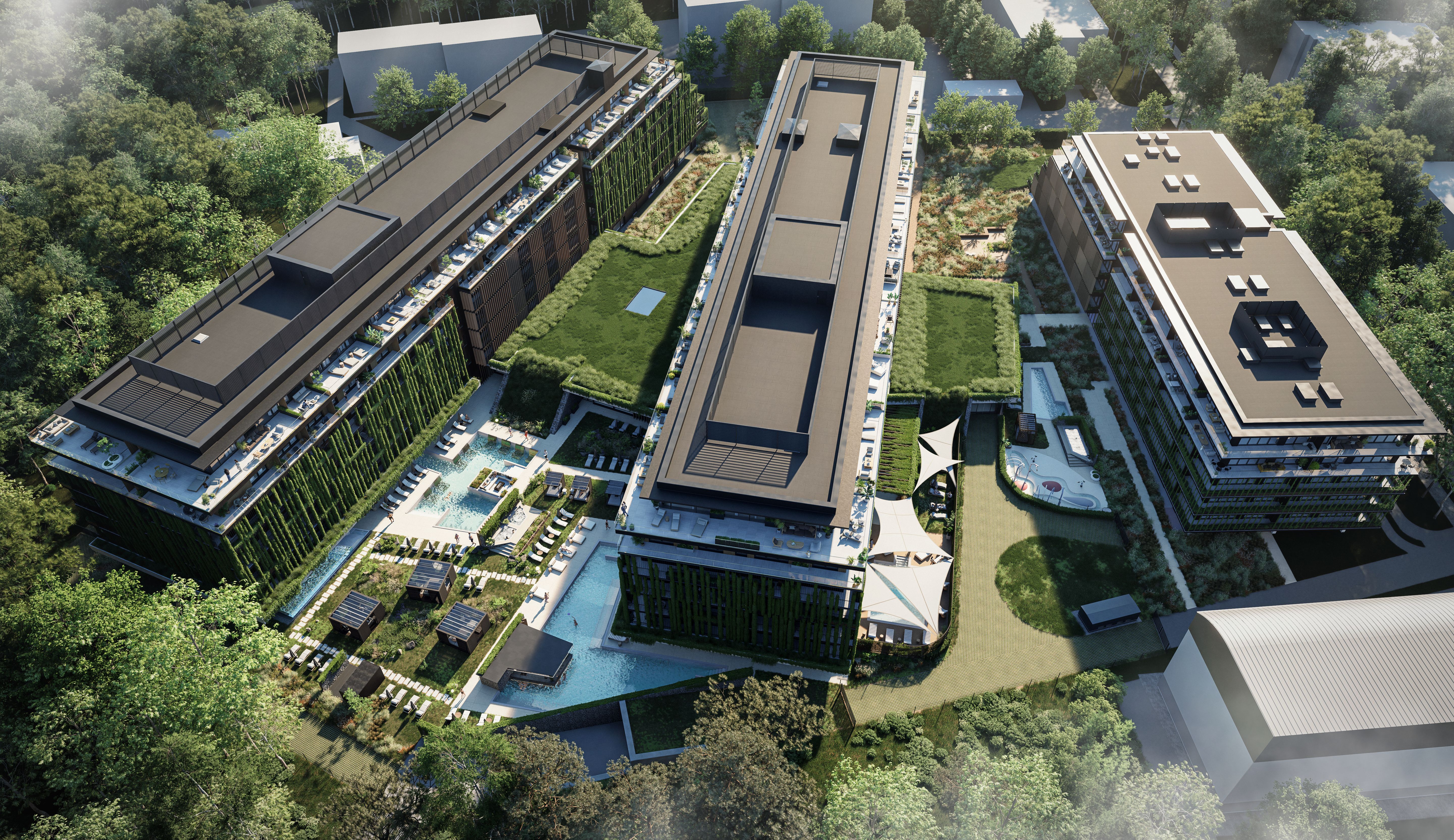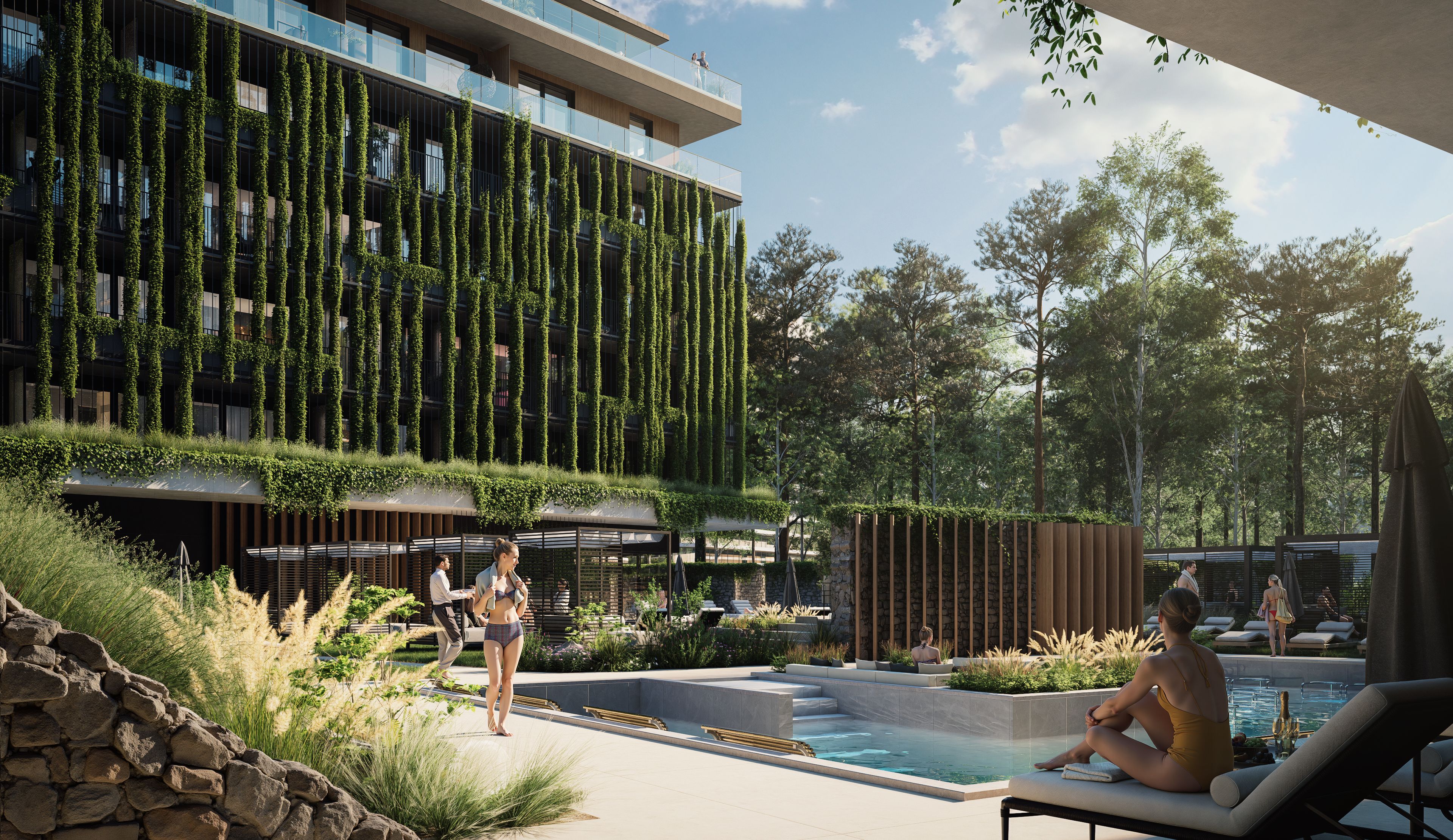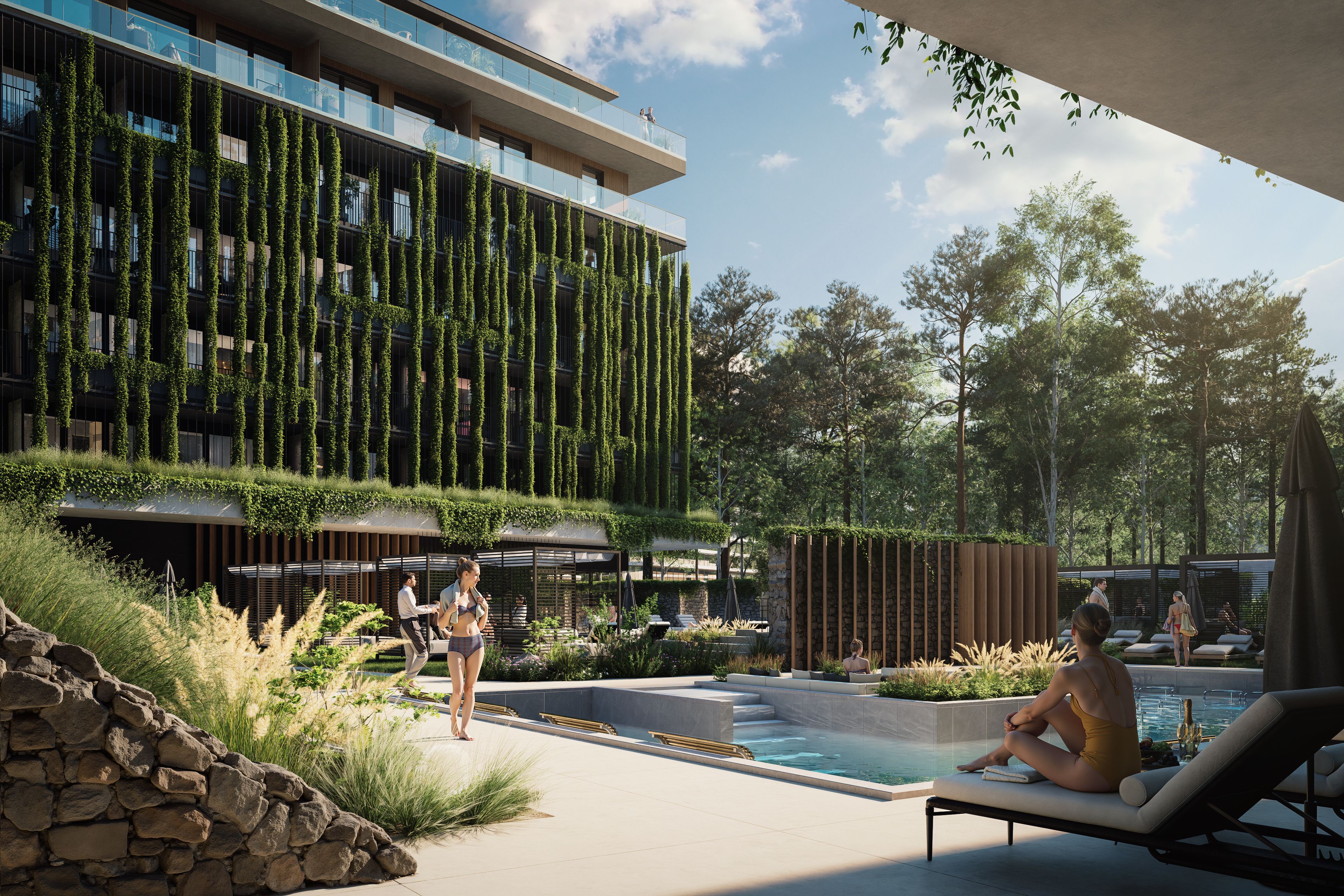 Ponad 50% terenu inwestycji stanowi roślinność – zielone dachy, wertykalne ogrody, ścieżki jogi i kameralne patia. Naturalne materiały i miękkie linie budynków przywołują surowe piękno bałtyckich klifów, a całość emanuje spokojem i elegancją