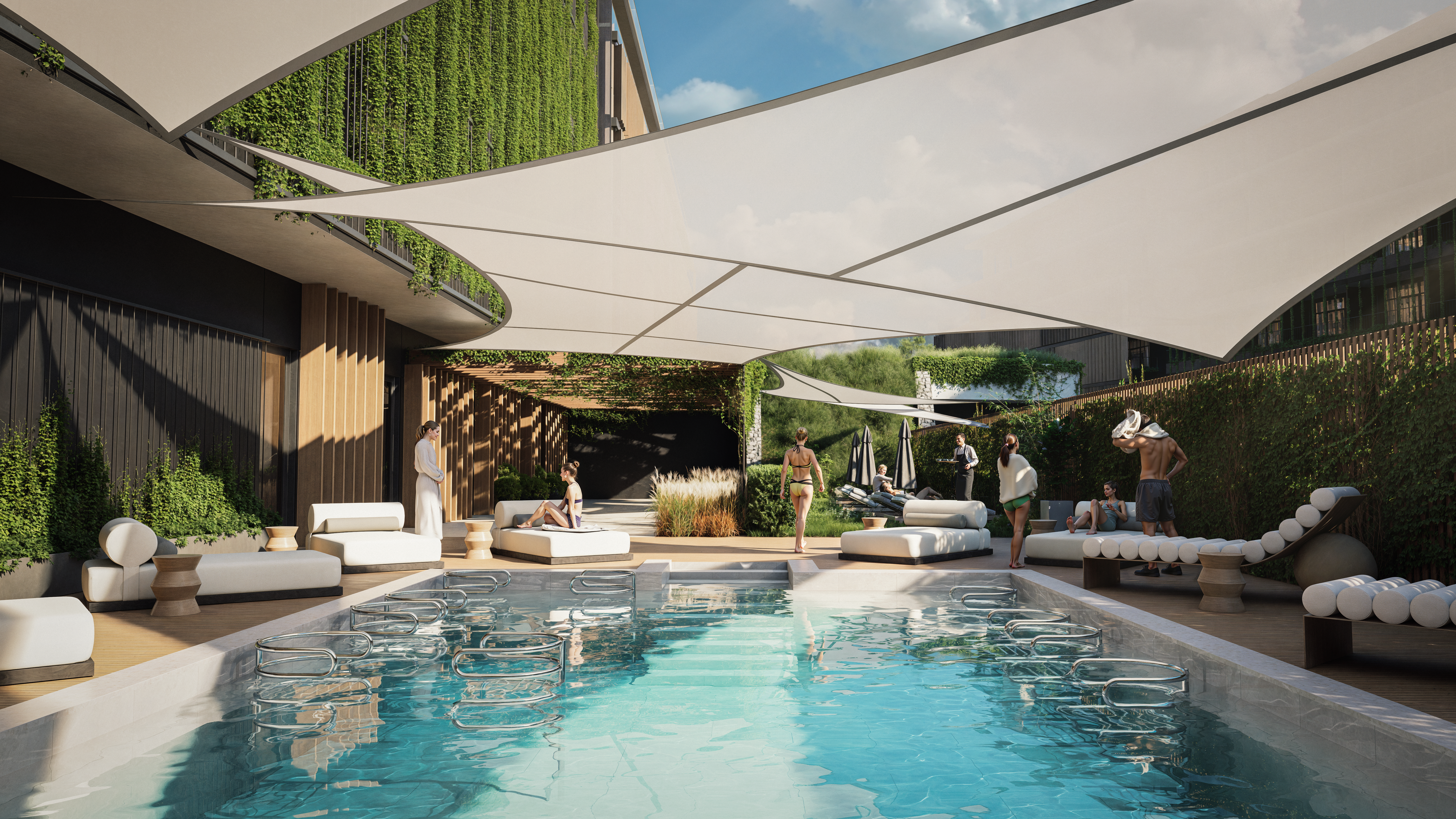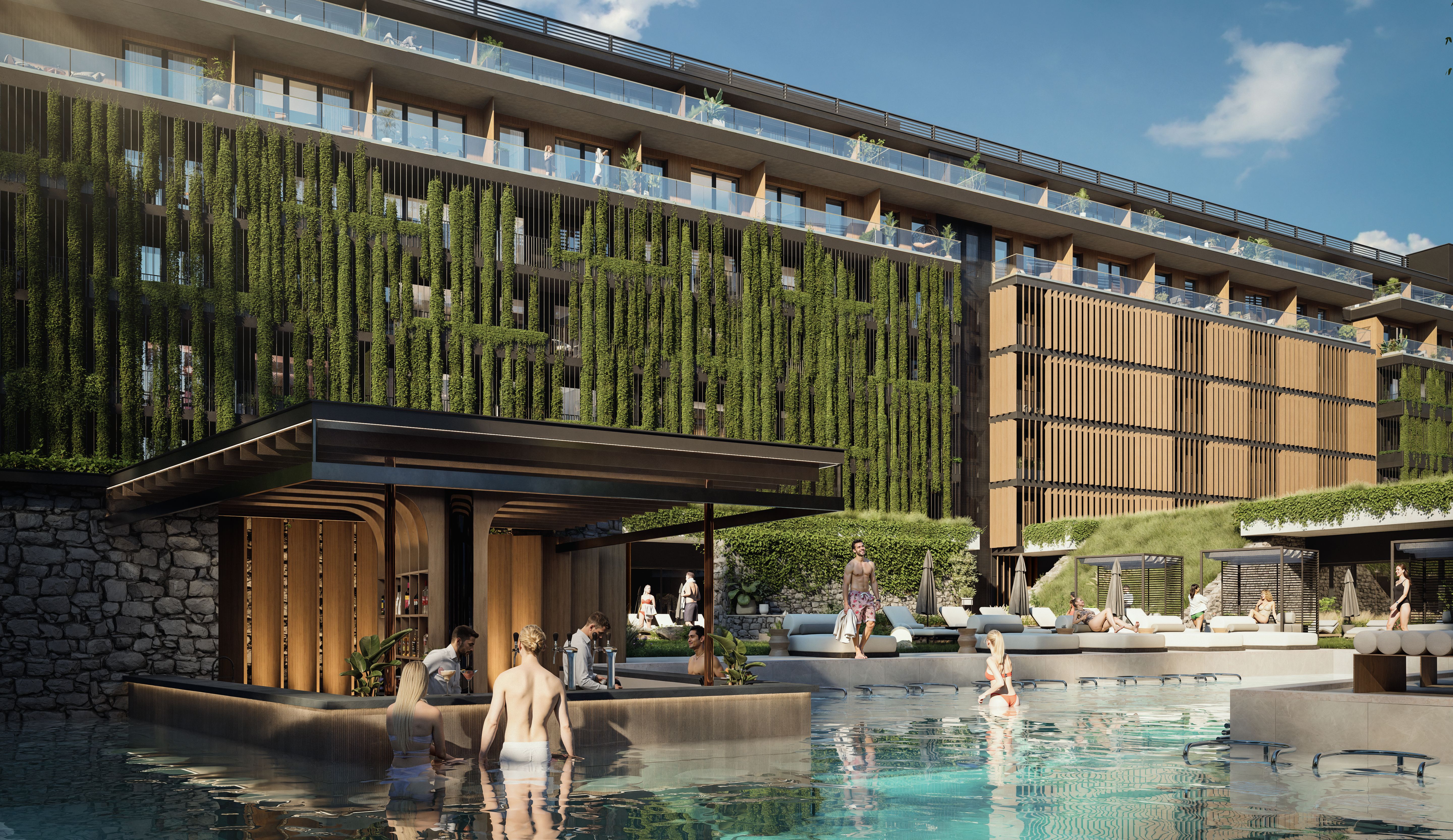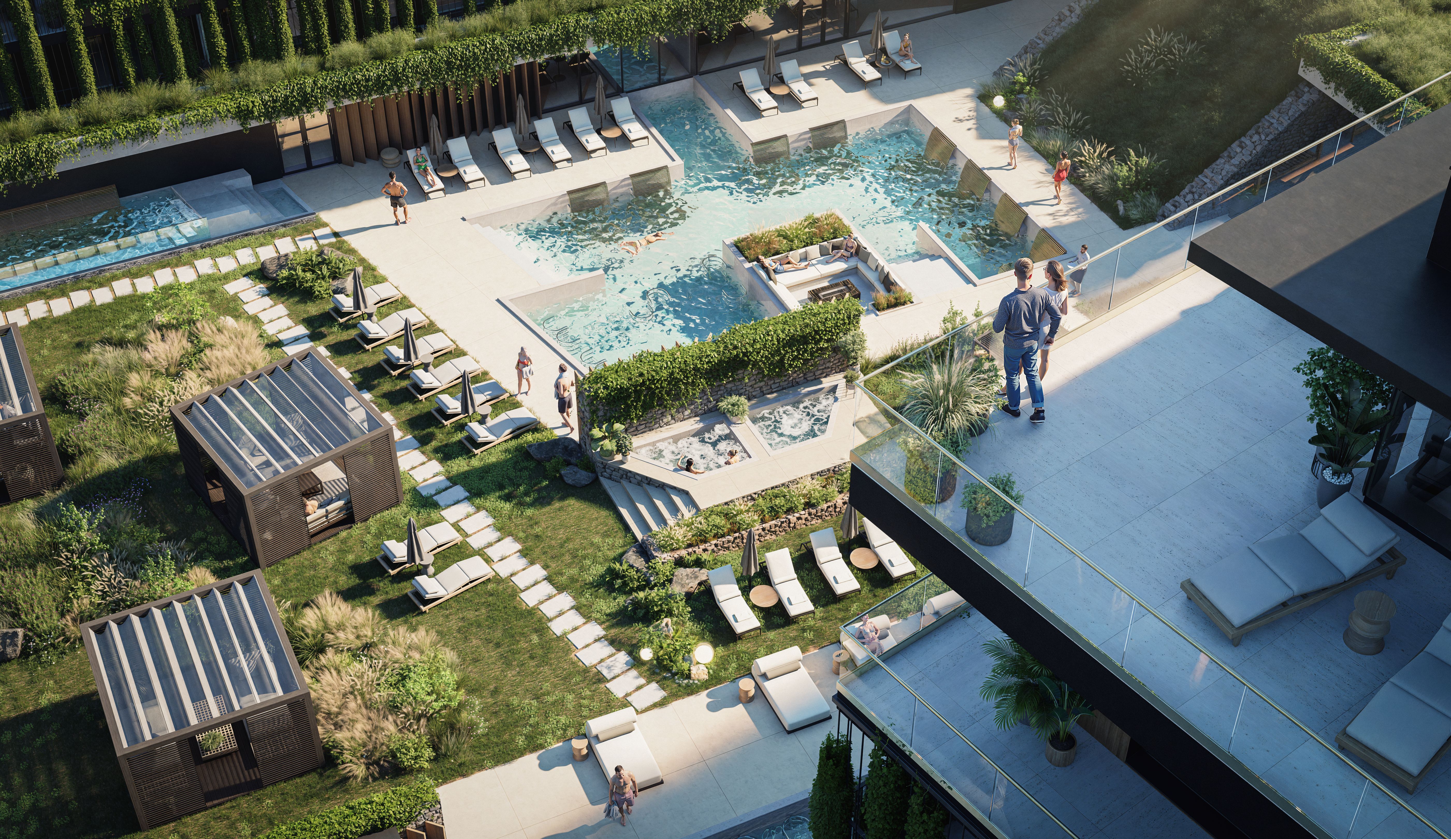Ponad 50% terenu inwestycji stanowi roślinność – zielone dachy, wertykalne ogrody, ścieżki jogi i kameralne patia. Naturalne materiały i miękkie linie budynków przywołują surowe piękno bałtyckich klifów, a całość emanuje spokojem i elegancją
